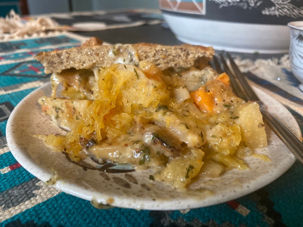 Last night I had tossed a large spaghetti squash into the oven, intending to use it today as pasta for a marinara I had in my refrigerator. Instead, I oiled and buttered the bottom of a cast-iron baking dish and pressed the cooked, seasoned squash in to create a “crust”. Baked the crust at 425 for 20 minutes to crisp it up a little then added my filling – roasted garlic, onions, potatoes, butternut squash, chicken sausage, chopped water chestnuts, marjoram, bay, garlic, salt, pepper. All leftovers from a previous meal.