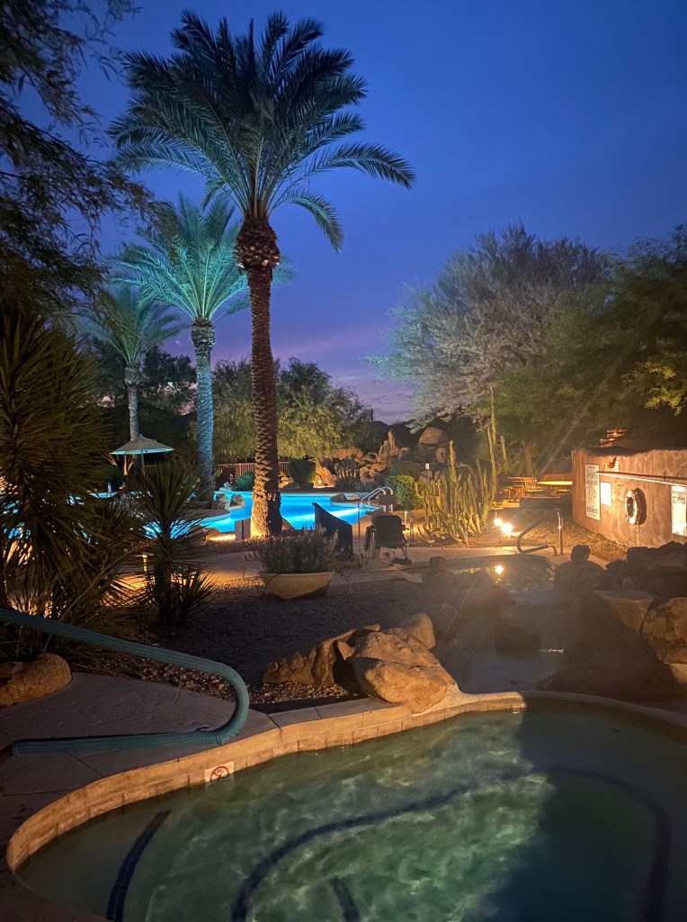 As soon as I walked into the fabulous two-bedroom villa I had booked, I knew it was where I was supposed to stay.  The space is beautifully appointed in Southwestern style, complete with a fully equipped kitchen, two huge bedrooms and a spa bathroom.  I immediately booked two more nights.  I was even more thrilled to discover that the pools and hot tubs were open, though social distancing is encouraged and the disinfecting protocols enhanced.  After settling in to my room, I went down for a soak to ease the tension of several days of travel from my muscles and mind, incredibly grateful to sit in hot water in nature, but the experience was so much greater than a soak. I wish I could somehow send the sound of the cicadas whirring in the early evening light; unearthly to this Washingtonian, transcendent.   I wonder what they sing –  and if it’s to each other or just because?
